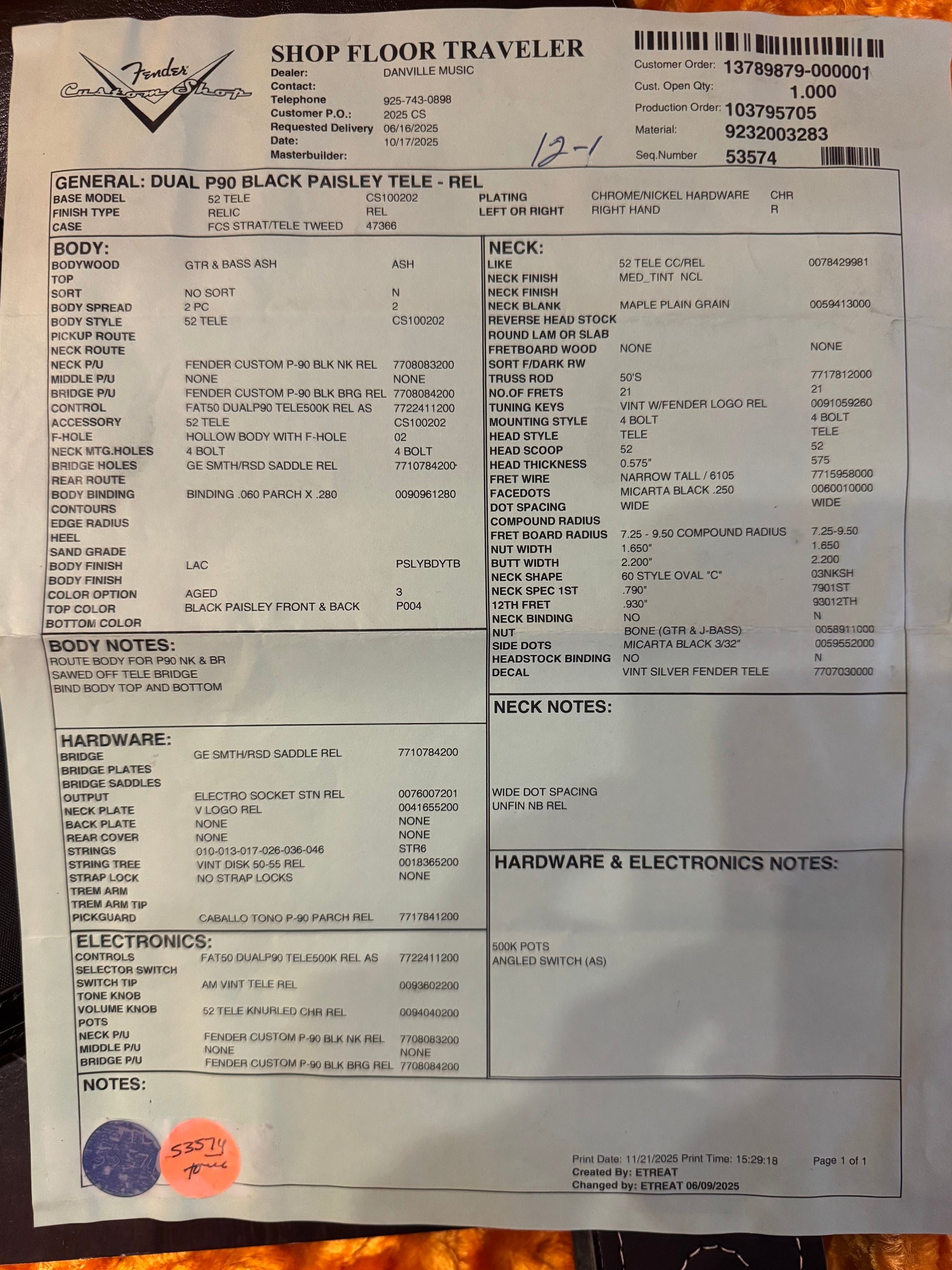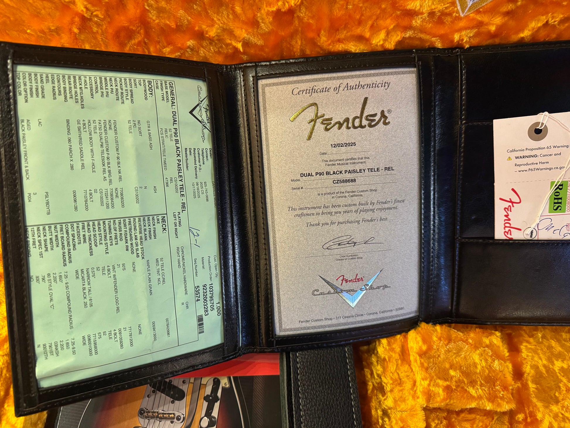 For sale is a brand new Fender Custom Shop Dual P-90 Telecaster Relic in a BEAUTIFUL black paisley finish. This guitar is incredibly resonate and plays and sounds amazing. This guitar sports custom shop P-90s, a 52 tele neck in medium tint, narrow tall 6105 frets, a 60s style oval C neck shape, and a 7.25"-9.50" compound radius. Comes with Original Hard Case, case candy, and CoA. Danville Music is an Authorized Fender Dealer, you can buy with confidence and the instrument comes with the full Fender lifetime Warranty. We inspect and professionally set up every instrument we sell so you can buy with confidence, helping you fall in love with your new instrument. Feel free to message us with any questions.