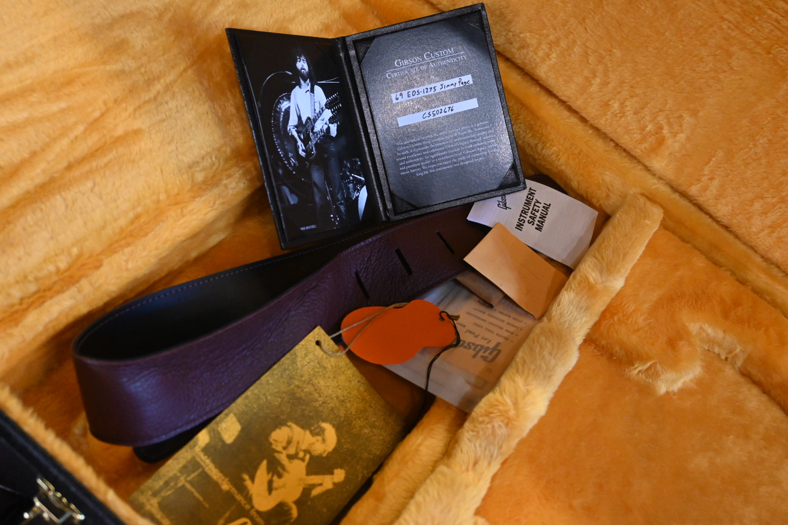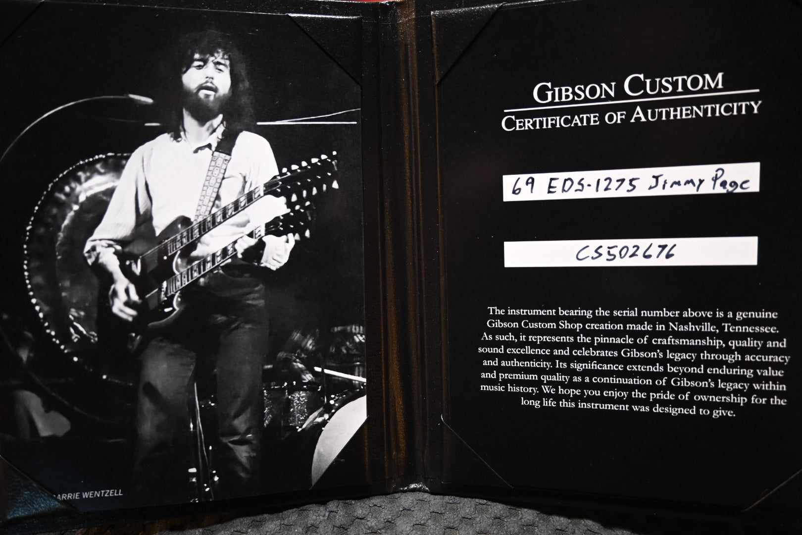 Here is your opportunity to own a clone of Jimmy Page’s famous 1969 EDS-1275, identical to how it appeared on the day that he originally received it. A Gibson Custom hardshell case is included, along with a vintage leather strap and a certificate of authenticity with a photo from famed photographer Barrie Wentzell.
