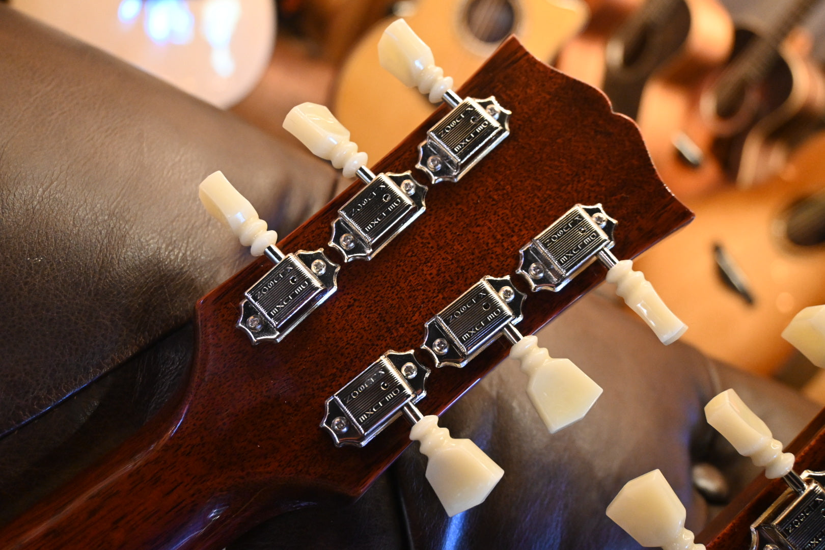 The Jimmy Page EDS-1275 features a double-cutaway one-piece mahogany body that provides exceptional access to the full length of both the 12-string and six-string mahogany necks. Both necks have long tenons and are hide glue fit, and the neck profiles are recreated from 3D scans of the necks on the original guitar. The necks are both capped with bound Indian rosewood fretboards. Each fretboard is equipped with 20 authentic medium jumbo frets and adorned with aged cellulose nitrate parallelogram inlays. The fretboards of both necks have a 12” radius, which is perfect for both playing chords as well as for string bending while soloing. The 18 tuners are Kluson® double line, double ring style, just like those found on the original guitar, and even the headstocks feature the correct 17-degree angle and specific logo stylization found on Jimmy’s EDS-1275.