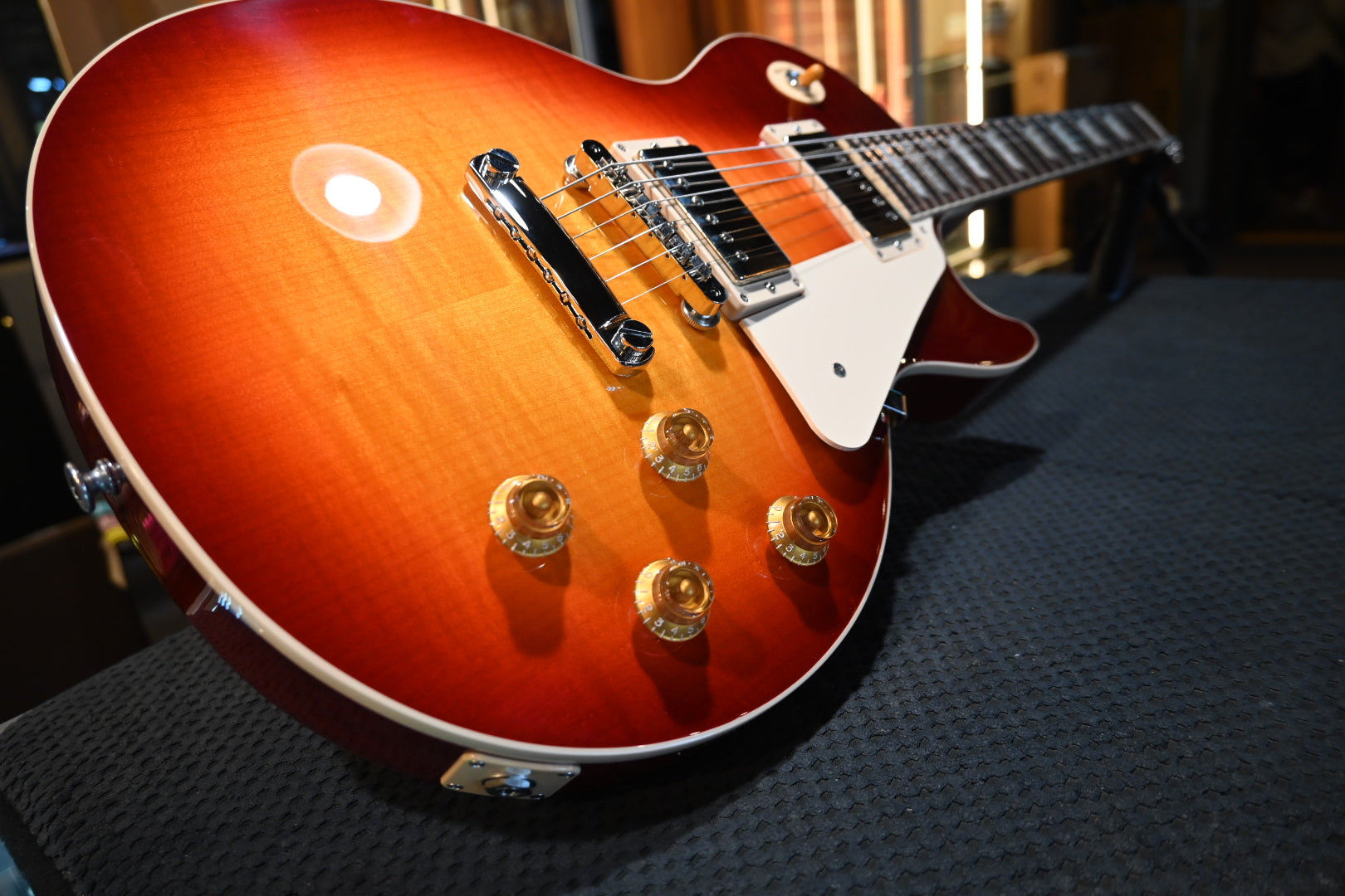 The Les Paul™ Standard 50s Figured Top returns to the classic design that made it relevant, played, and loved – shaping sound across generations and genres of music. It pays tribute to Gibson's Golden Era of Innovation and brings authenticity back to life. It boasts a solid mahogany body, an AA figured maple top, and a distinctive translucent custom color nitrocellulose lacquer finish that showcases the figured maple top. The mahogany neck has a rounded 50s Vintage profile and a rosewood fingerboard with trapezoid inlays. The Les Paul Standard 50s Figured Top is equipped with an ABR-1, the classic-style Tune-O-Matic™ bridge, an aluminum Stop Bar tailpiece, Vintage Deluxe tuners with Keystone buttons, and gold Top Hat knobs. The calibrated Burstbucker™ 1 (neck) and Burstbucker 2 (bridge) pickups are loaded with Alnico 2 magnets and wired to audio taper potentiometers and Orange Drop® capacitors. A hardshell case is also included.