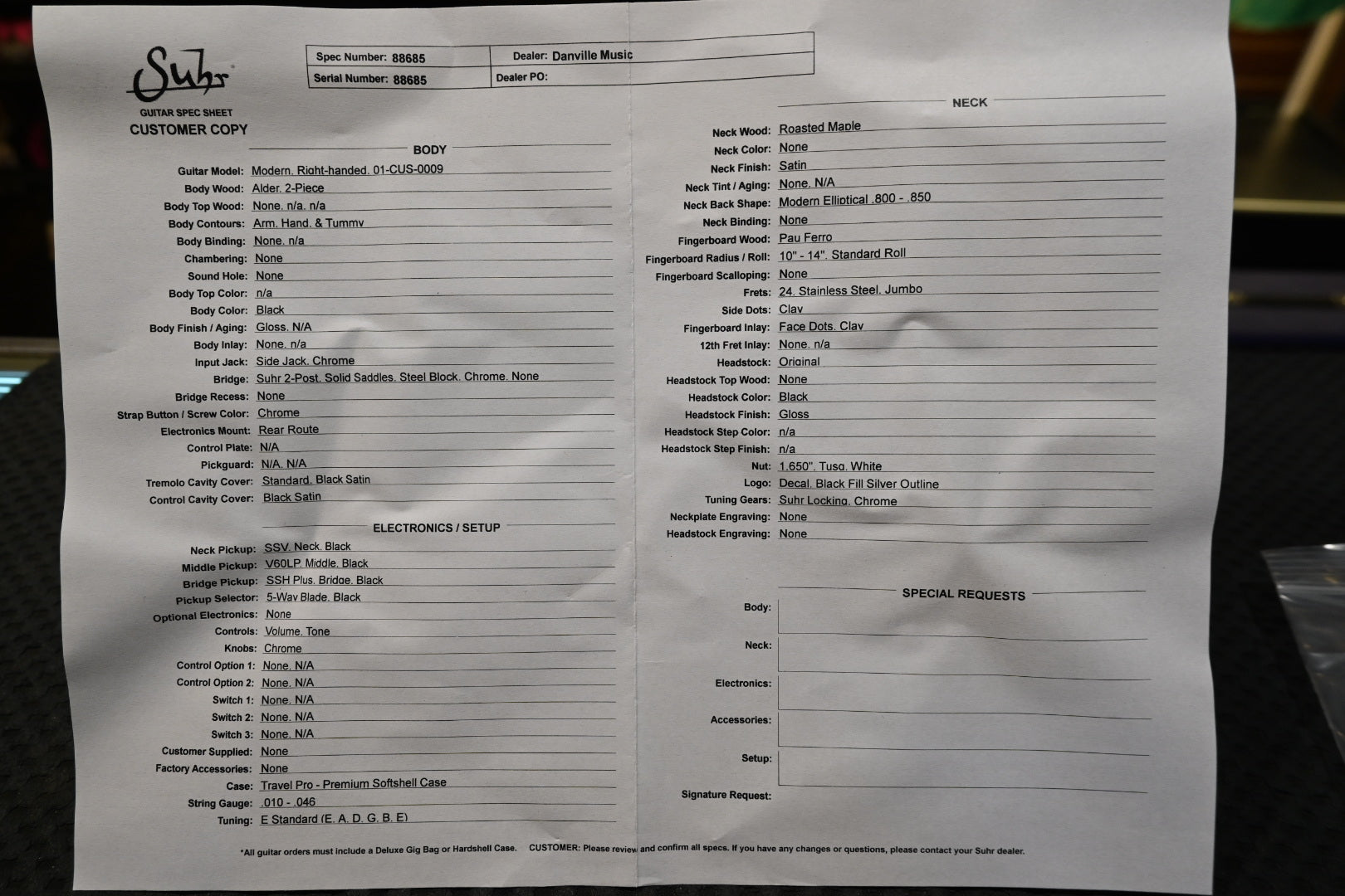 For sale is a brand new Suhr Custom Modern in a clean and classy Black. Super fast playing guitar too with jumbo stainless steel frets and a roasted maple neck. Just awesome. Comes with Original Hard Case, trem bar, case candy, and spec sheet. Danville Music is an Authorized Suhr Dealer, you can buy with confidence and the instrument comes with the full Suhr lifetime Warranty. We inspect and professionally set up every instrument we sell so you can buy with confidence, helping you fall in love with your new instrument. Feel free to message us with any questions.
