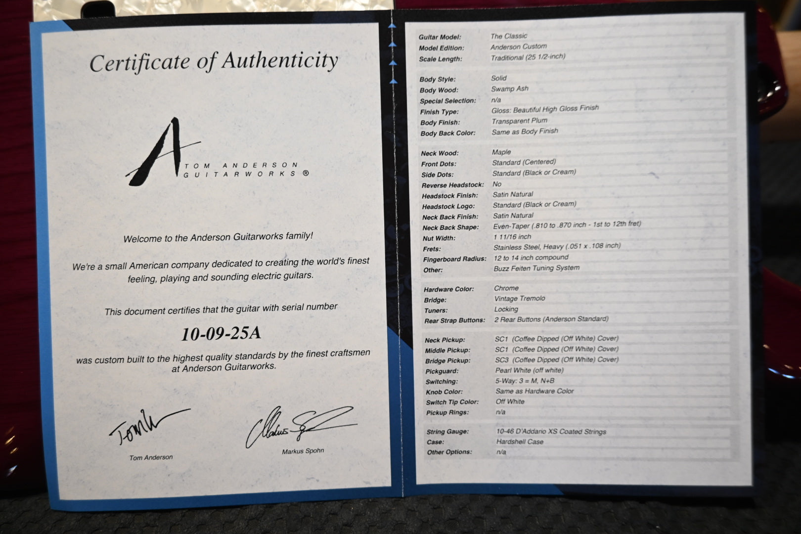 For sale is a brand new Tom Anderson Classic in the all-time great Translucent Plum finish. This guitar is just fantastic. Sounds and plays beautifully. Comes with OHSC. Danville Music is an Authorized Tom Anderson Dealer, you can buy with confidence and the instrument comes with the full Tom Anderson lifetime Warranty. We inspect and professionally set up every instrument we sell so you can buy with confidence, helping you fall in love with your new instrument. Feel free to message us with any questions!